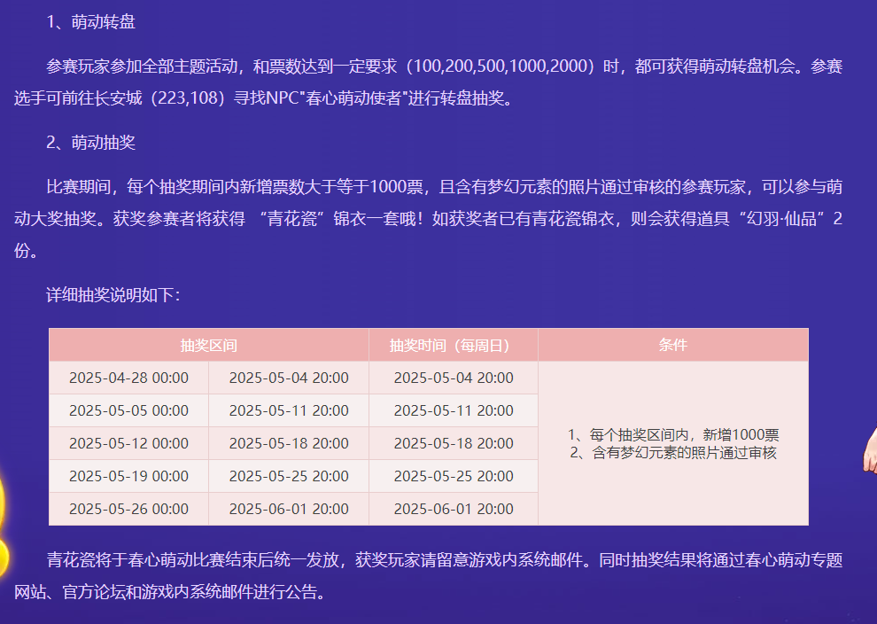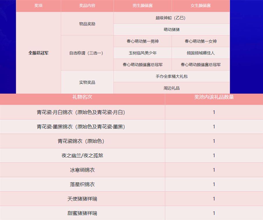上面是在春星萌动活动玩法中能够百分百获得青花瓷锦衣,还有一些稀有的坐骑的方式,首先是各位玩家在男生颜值赛和女生颜值赛的比赛中拿到了全服总冠军的成绩,这样是肯定可以获得一个萌动猪猪的,除此之外还会有手办全家桶大礼包和其他的周边礼物,然后就是在投票中如果能够拿到前三名。这样就可以获得青花瓷锦衣,其中有两套青花瓷锦衣是有月白和墨黑染色的。