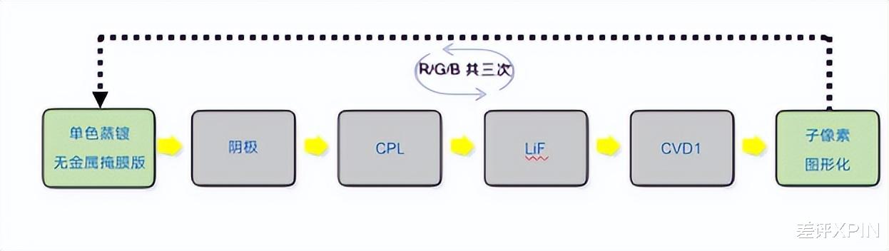 因为 OLED 所使用的有机材料限制,没办法进行常见的蚀刻工艺,所以就只能一次性将三种材料进行沉积处理。