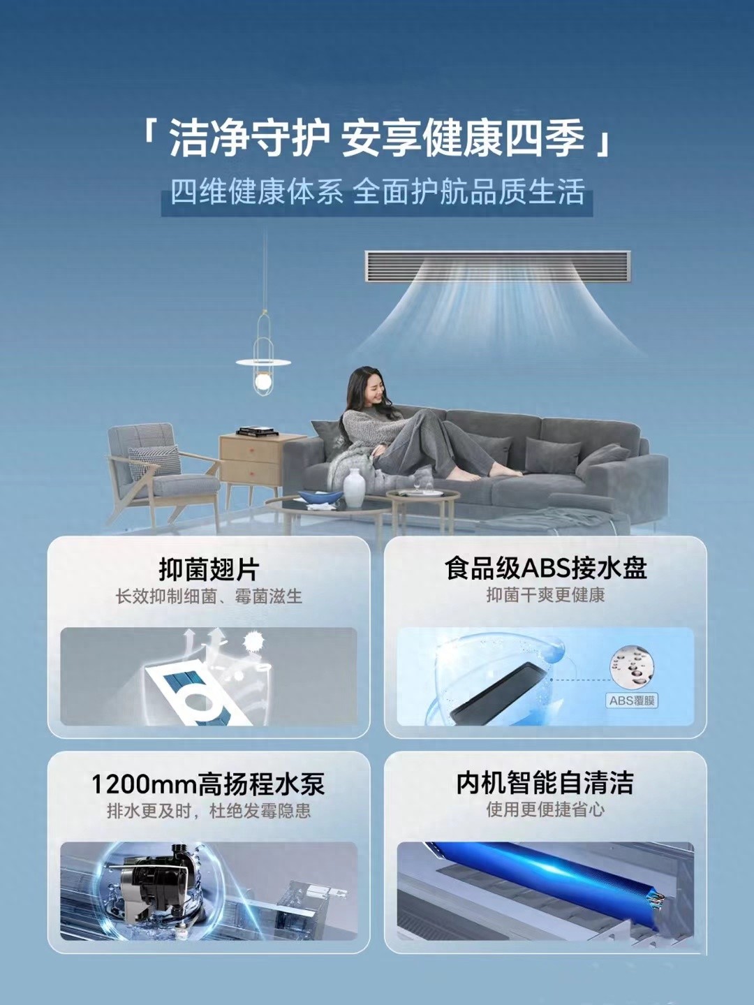 1200mm高扬程水泵,以强大的排水能力,快速排出冷凝水。通过缩短积水停留时间,杜绝了因积水导致的发霉风险,维持空调内部干燥,为健康运行创造良好条件。内机智能自清洁功能,则是利用先进的技术算法。在空调运行一段时间后,自动启动清洁程序,通过结霜、化霜等过程,带走内部灰尘和污垢,保持空调内部洁净如新。