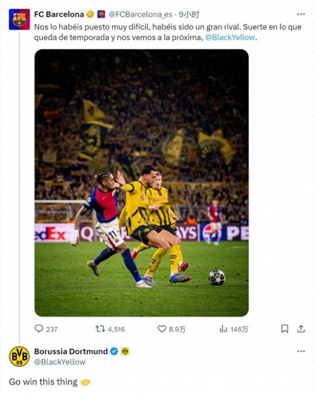 巴萨官方社媒赛后发文,向多特致敬:“你们给我们制造了很大的困难,你们是强大的对手。祝你们在赛季余下比赛中好运,下次再见,多特。”