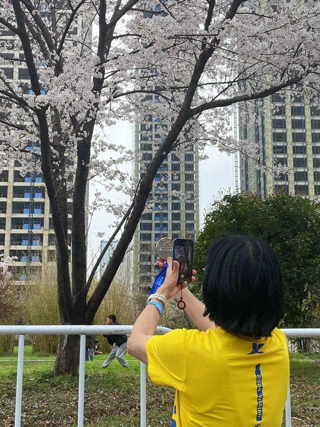 选手们完赛后拿奖牌与樱花合照。图/九派新闻 李杨