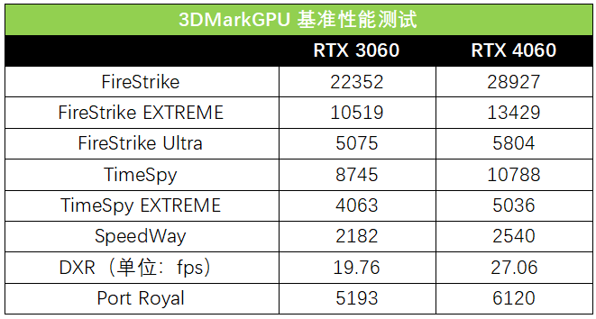 首先来对比一下两款显卡的基准性能,可以看到RTX 4060相对RTX 3060还是有比较大的性能优势,在DX11的FireStrike测试项目和DX 12的TimeSpy测试项目平均领先RTX 3060约23%。RTX 3060的综合性能可以达到RTX 4060的76%左右。