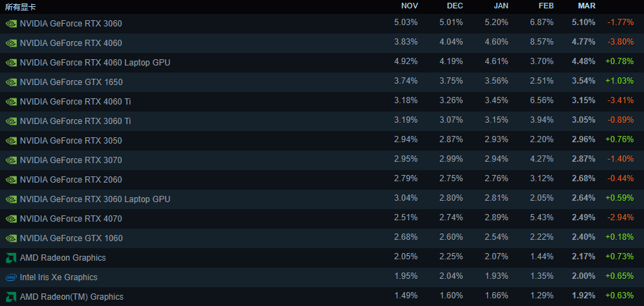 尽管每一代的新显卡相对上代显卡都会有巨大的提升,但是对于大多数玩家来说,一款甜品卡完全可以支撑到隔代升级,这也让历代60显卡拥有巨大的保有量。根据3月份的Steam硬件调查报告,RTX 3060再次超过RTX 4060,成为占有率最高的显卡。这就不禁让我们好奇,在2025年的今天,当一个RTX 3060“钉子户”的体验究竟怎么样?有没有必要升级性能更强的显卡?