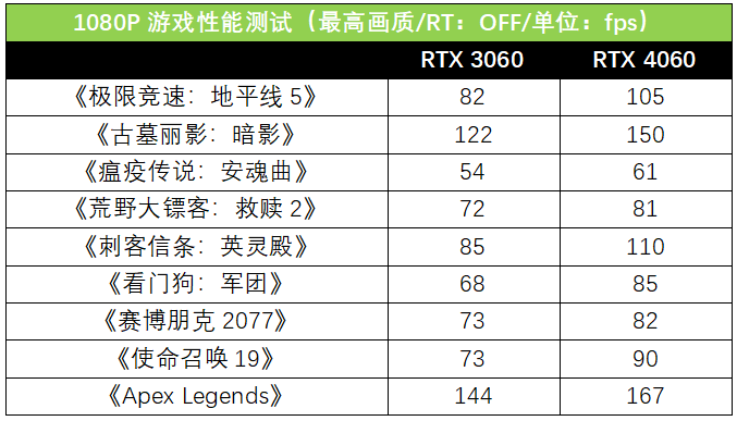 实际的游戏性能方面,我们分别测试了1080P分辨率和2K分辨率下两款显卡的帧率表现,游戏设置采用最高画质预设。在1080P分辨率下,RTX 3060平均帧率达到RTX 4060的80%左右,略高于基准性能测试的表现。而从帧率上来看,两款显卡的差距也不是特别大,RTX 4060只比RTX 3060高了18fps。