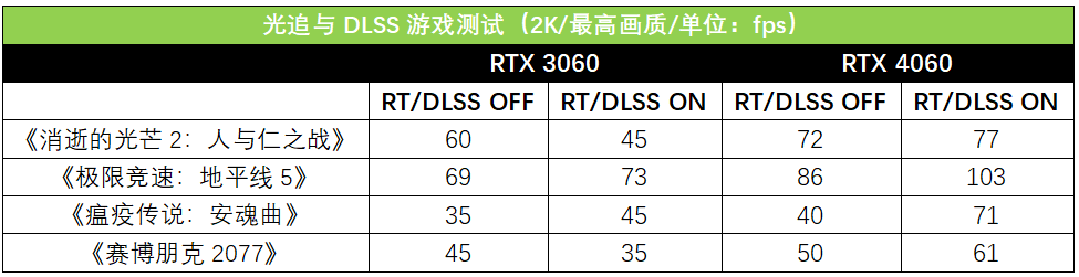 我们知道,新的显卡除了传统性能提升,还有光追性能和DLSS技术的升级,RTX 3060支持DLSS 2而RTX 4060支持DLSS 3,DLSS 3主要升级的地方是在超分辨率的基础上增加了帧生成技术。接下来,我们使用这两款显卡测试了几款2K光追游戏。