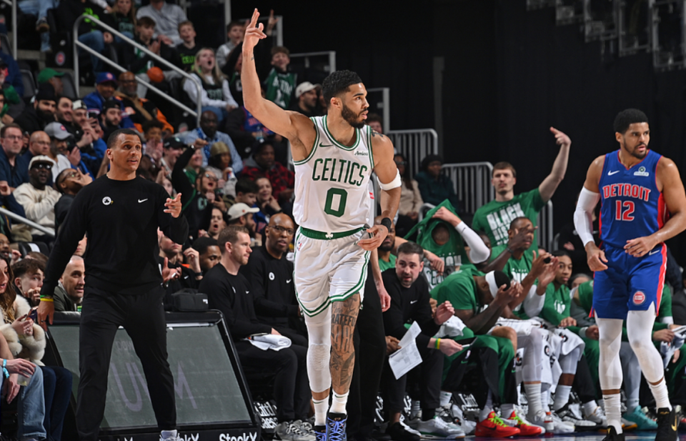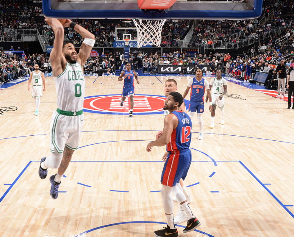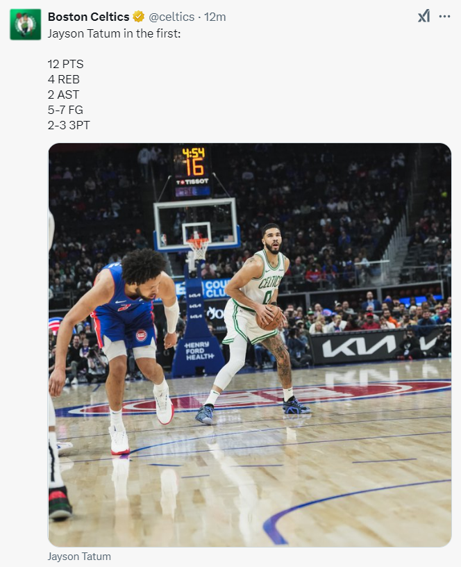 比赛一开始,塔图姆就展现出了极佳的状态。他在首节打满12分钟,7投5中,三分球3投2中,贡献了12分、4篮板和2助攻。尤其是他面对活塞后卫CC时,顶开防守完成三分命中的一幕,堪称精彩。对于这位赛季命中率45%+三分命中率35%的球员来说,这是一个近乎完美的开局。