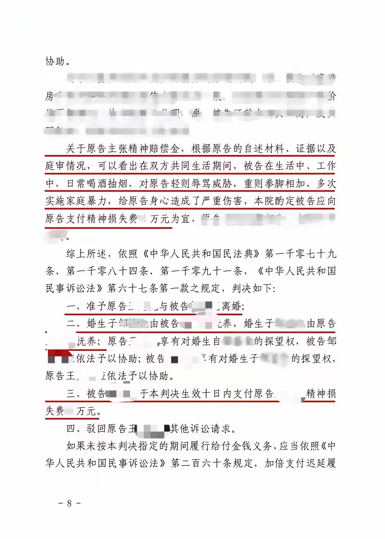 23年8月,当地法院判决书显示:原告称婚后长期遭受丈夫家暴,给其生理和心理造成了严重的伤害,请求判令双方离婚。