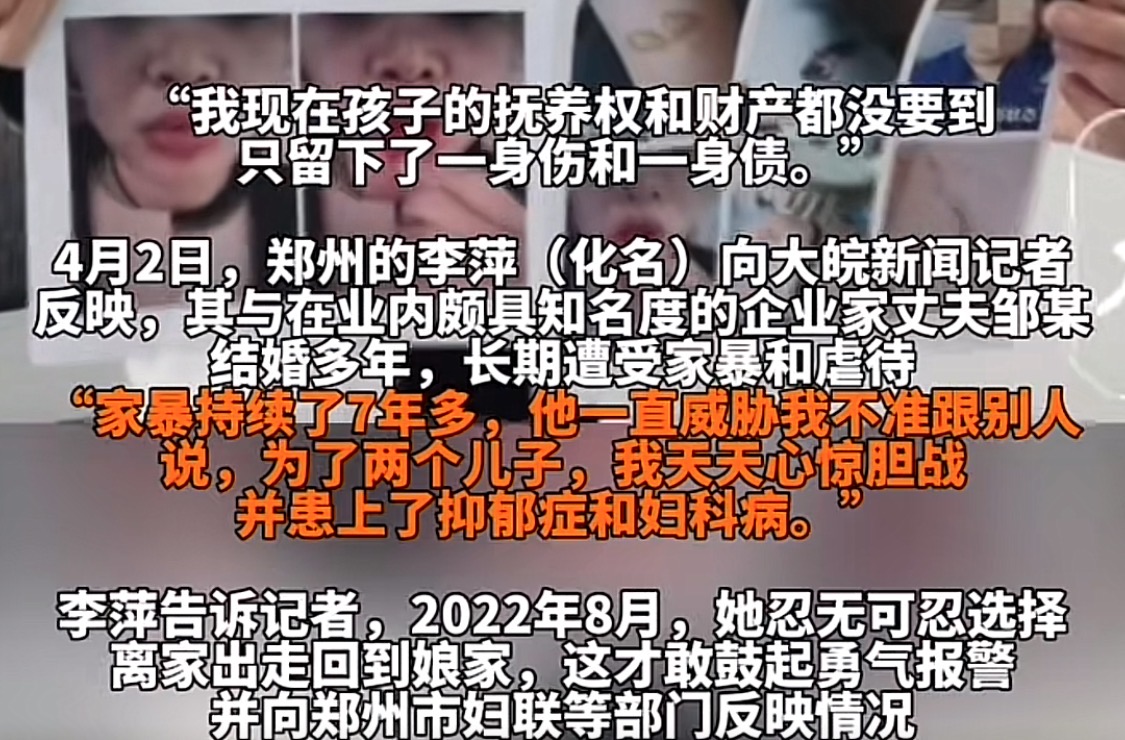 近日,郑州一女子曝自己被企业家丈夫长期家暴和虐待!