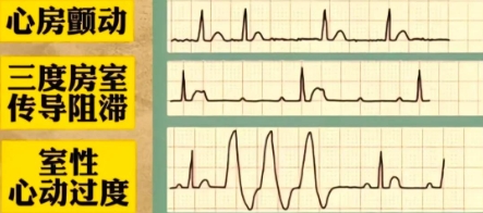 QRS波宽大畸形,提前出现无P波。T波方向与QRS反,心肌缺血要警惕。
