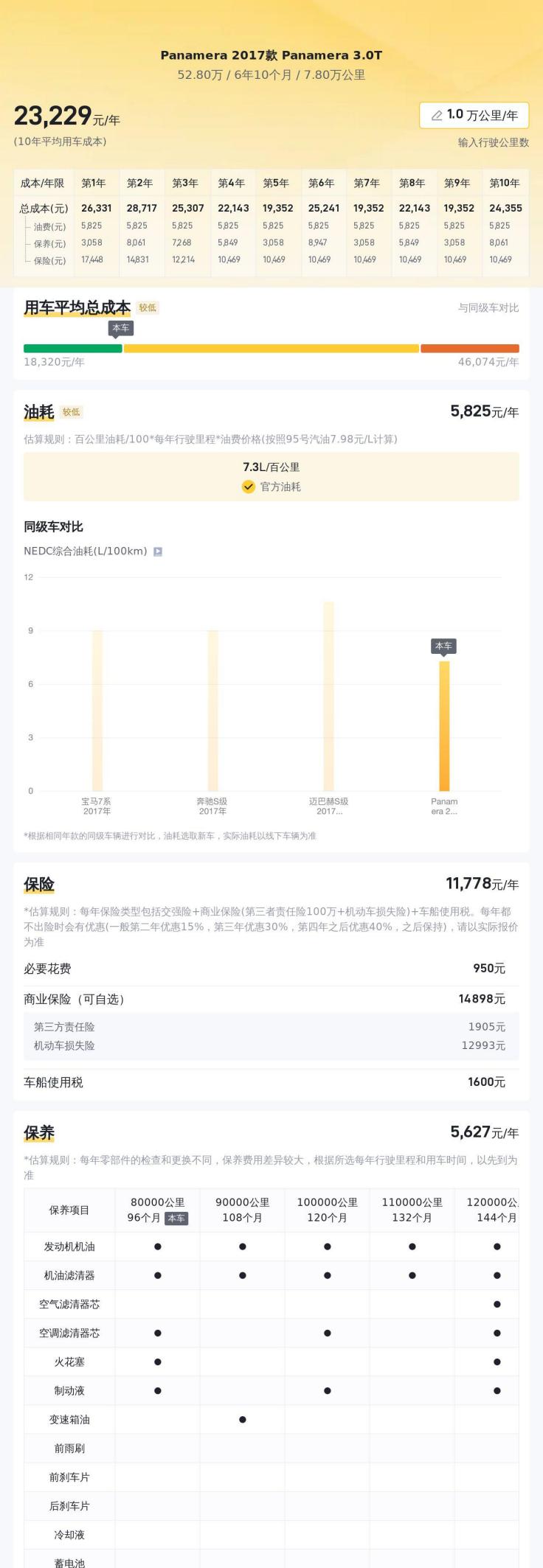 对于很多消费者来说,购买二手豪华车的一个主要顾虑就是后期的维护成本。毕竟,豪华车的零部件价格和工时费都比较高,一旦出现故障,维修费用可能会是一笔不小的开支。 根据估算,这辆Panamera的年均综合用车成本大约为2.3万元,其中包括燃油费、保险费、保养费等。这个数字可能会因为个人使用习惯和所在地区等因素而有所变动,但总体来说,与同级别的其他豪华车型相比,Panamera的用车成本处于中等水平,并没有想象中那么高不可攀。 当然,在购买之前,最好还是做好详细的预算,并预留一部分资金用于应对突发状况,才能更好地享受驾驶的乐趣,而不是被后期费用压得喘不过气。