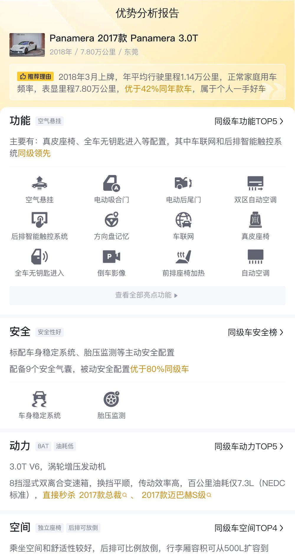 在二手车市场中,同款车型的价格也可能因为车况、配置、里程等因素而有所不同。根据市场行情,2017款 Panamera 3.0T的二手车价格大致在48.7万至59.34万元之间。52.8万的报价,处于市场行情的中间价位,结合这辆车的车况和配置来看,性价比还是比较高的。当然,最终的成交价格还需要根据实际情况进行协商。