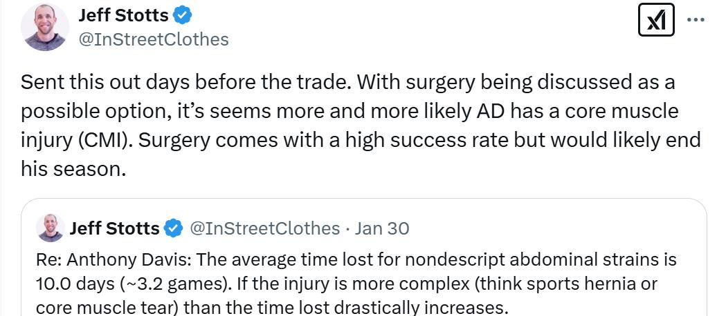 Jeff Stotts表示从现有各方面的消息来看,浓眉哥可能遭遇了核心肌群伤病。