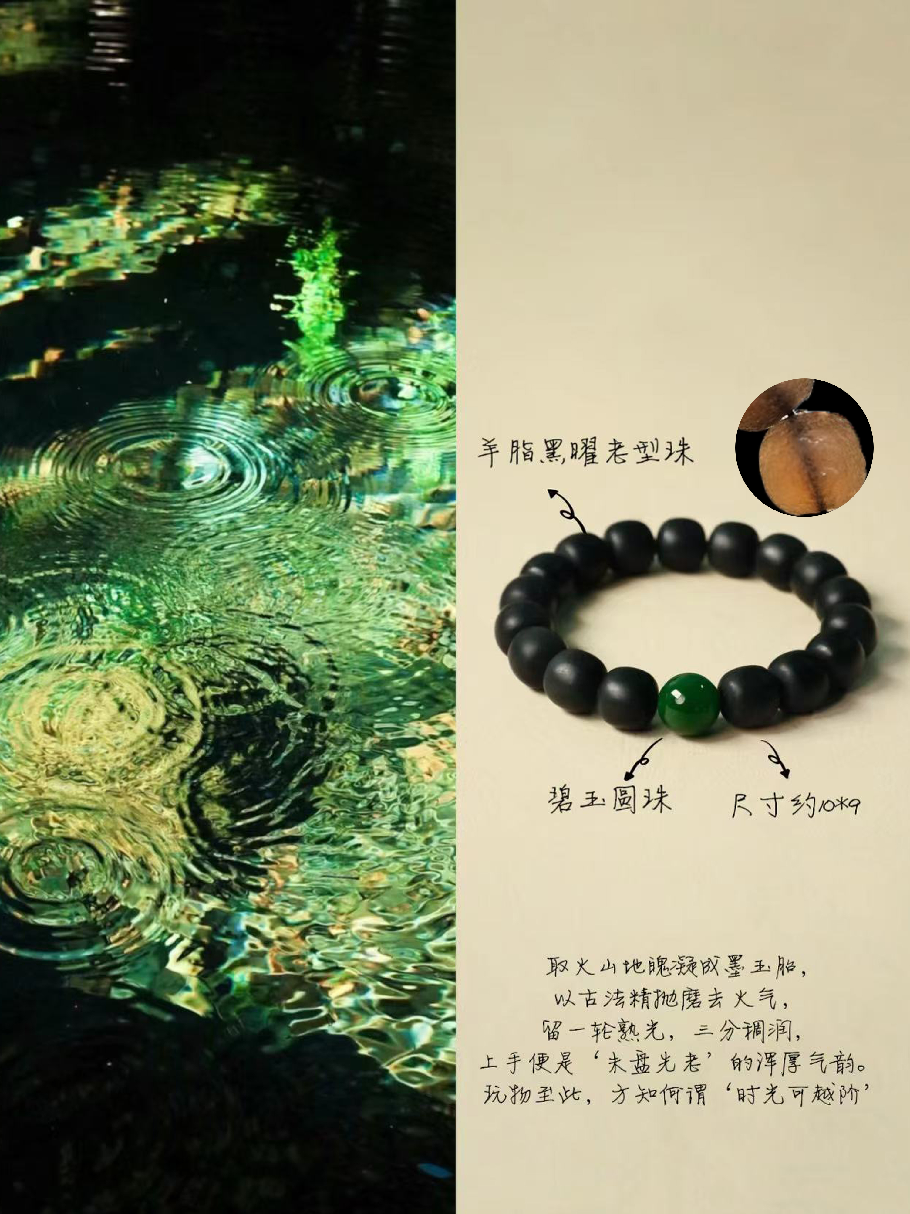 承古珠千年形制,赋当代极简风骨。老型珠浑厚端庄的轮廓,与羊脂黑曜石的冷艳光泽碰撞出矛盾美感。既宜素串叠戴演绎新中式风雅,亦可单珠点睛诠释低调奢华,是文房案头的风骨,亦是腕间行走的山水。
