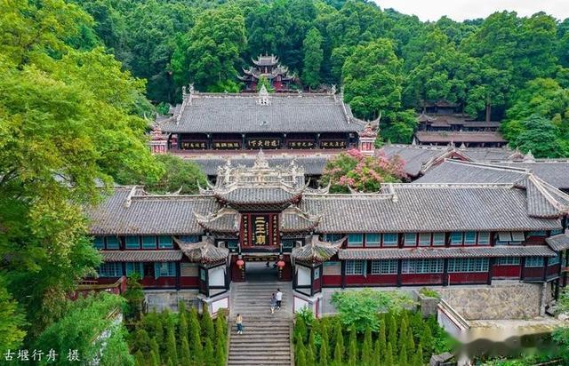 都江堰二王庙背靠玉垒山,与岷江古堰相对,南与青城山道观群遥相对应,西可望见白雪皑皑的岷山,气势恢宏,风景秀丽。