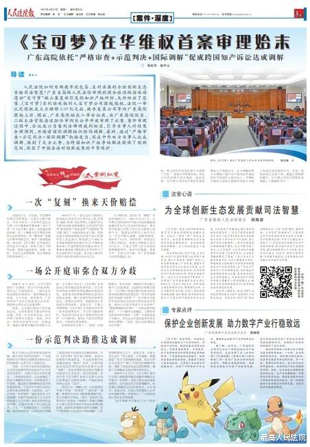 2025年2月12日,《宝可梦》案双方当事人就赔偿问题达成最终调解协议并提交广东高院,法院立即启动快速审查程序,当天就出具了民事调解书,依法确认调解协议的法律效力。2月18日,麦某公司、方某公司在媒体上公开发布道歉声明,向权利人、广大游戏玩家以及社会各界致歉。