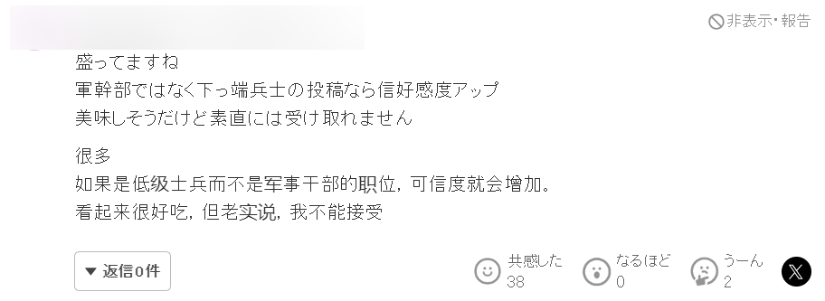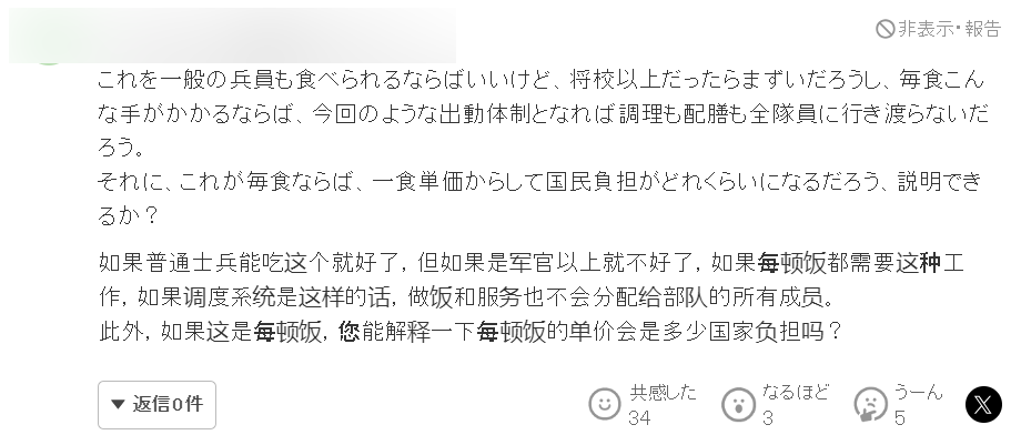 “如果普通士兵也能吃到这样的饭菜就好了,但如果是军官以上的话,这个餐标也就那么回事吧。吃顿稍微像样的饭都这么费劲,可见你们韩国的后勤都差成什么样了。另外,如果顿顿饭都是这个标准,那么公众又要为此花费多少税金呢?你们能解释一下吗?”