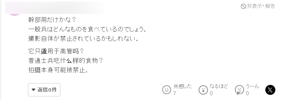 “只有干部才能吃到吗?那部队文职吃什么?还有,为什么韩国军人可以掏出手机来拍摄餐食?这种行为在部队里不是应该被禁止的吗?”