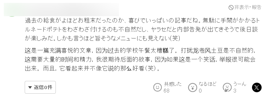 “看得出来你们韩国人对此很是得意,也是,谁让你们吃得那么差呢? 那串龙卷风土豆片花了你们不少心思吧?太假了,一点都不自然。等着吧,我觉得爆料人以后还会出来现身说法的,我就等着看笑话了。 这些东西看起来根本就不像是日常菜单上的菜品,而且我也怀疑这些东西有没有你们韩国人说的那么好吃。”