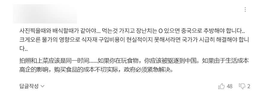 “你们最好不要玩摆拍那一套,拍照拍的是什么菜饭,打饭的时候打的也应该是什么饭菜……如果有人敢拿食物来开玩笑,那我们就应该将这群人逐出韩国,赶到中国去。”