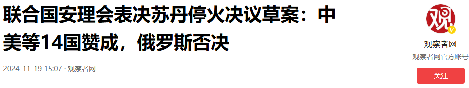 《联合国安理会表决苏丹停火决议草案:中美等14国赞成,俄罗斯否决》——观察者网