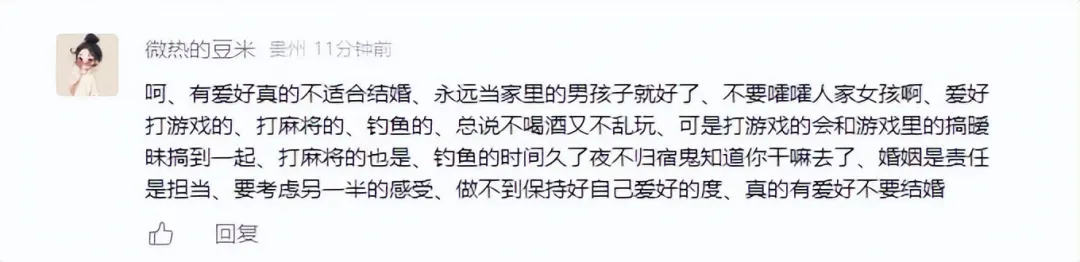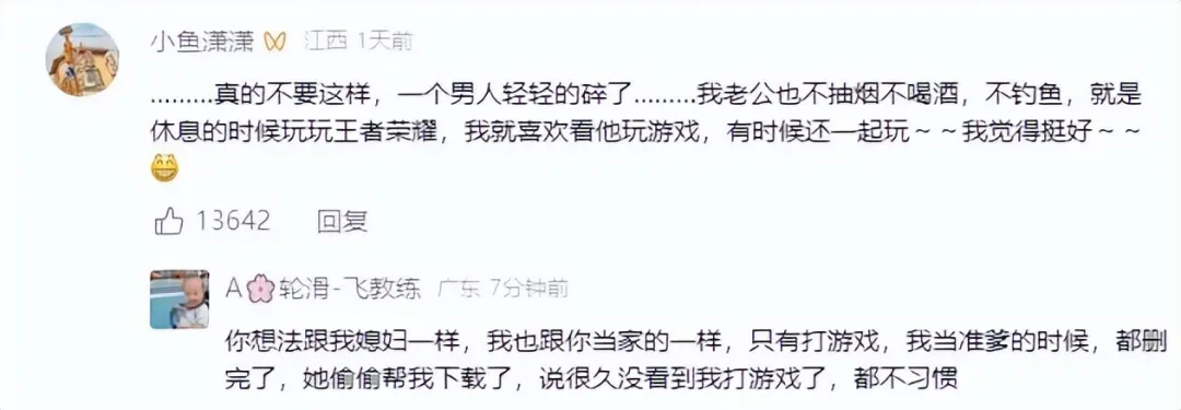 网友小鱼:………真的不要这样,一个男人轻轻的碎了………我老公也不抽烟不喝酒,不钓鱼,就是休息的时候玩玩王者荣耀,我就喜欢看他玩游戏,有时候还一起玩~~我觉得挺好。