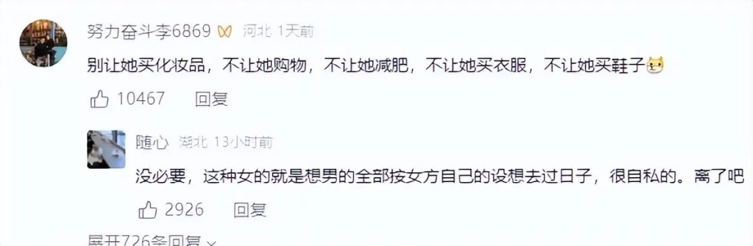 网友努力:不让她买化妆品,不让她购物,不让她减肥,不让她买衣服,不让她买鞋子。