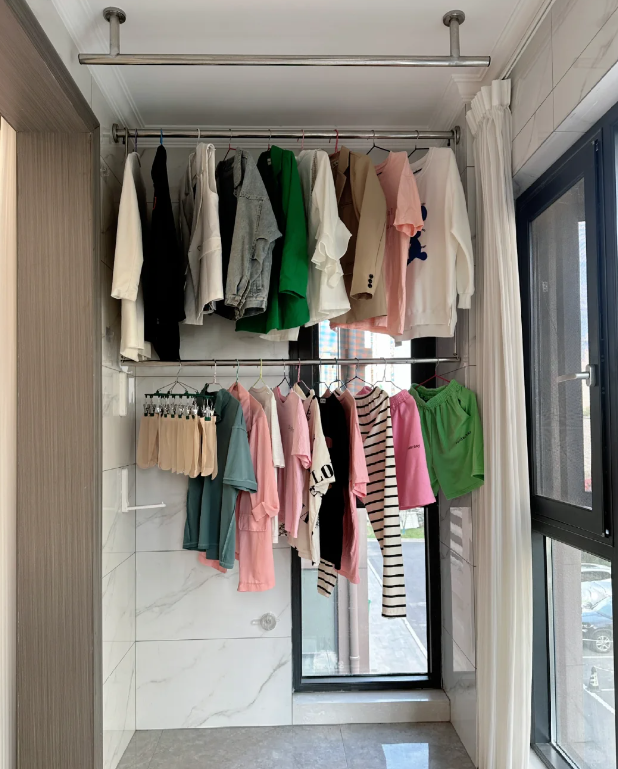 像我第2次装修就把阳台的晾衣架改到了侧边,这样的装修设计既可以满足我晾晒衣服的需求,同时还不会遮挡阳光,而且最重要的是家中来客人再也不用担心出现尴尬常见!