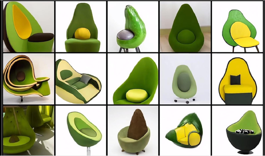上图是模型生成出来的牛油果椅子,相当于模型知道牛油果是什么,也知道椅子是什么,尽管世界上之前是没有人画过牛油果椅子或者造出过。AI模型仍然可以进行组合,生成既像牛油果又是个椅子的绘画作品。