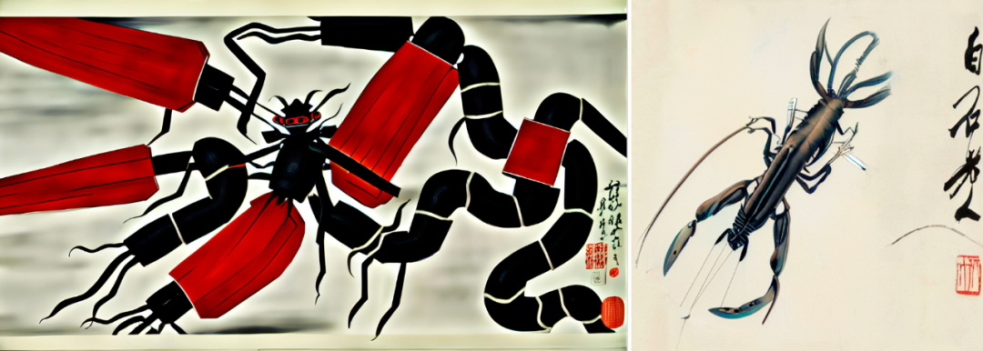 甚至可以去混搭一些概念,比如尝试不同的风格,像齐白石他有自己的绘画风格,但在新概念下,蒸汽朋克风、机械风都可以成为可能,我们也能创作一个齐白石画风的机械虾。