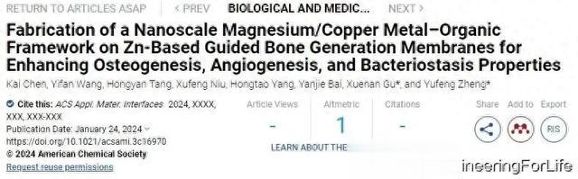 有鉴于此,北京航空航天大学顾雪楠、北京大学郑玉峰成功地在纯锌上制备了各种双金属Mg/Cu-MOF涂层,旨在促进锌底物的成骨、血管生成和抗菌活性。