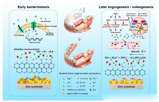 近年来,锌(Zn)及其合金作为引导骨再生(GBR)膜在调理植牙种植过程中牙槽骨体积不足和长期骨整合不稳定的问题方面显示出巨大潜力。然而,骨再生是一个复杂的过程,包括成骨、血管生成和抗菌功能。目前,纯锌在体内的成骨性能和抗菌活性还不够,因此制造一个赋予锌膜多功能的平台可能是解决这些问题的必要条件。