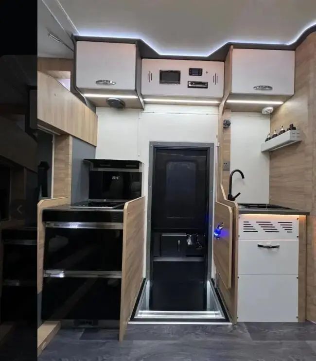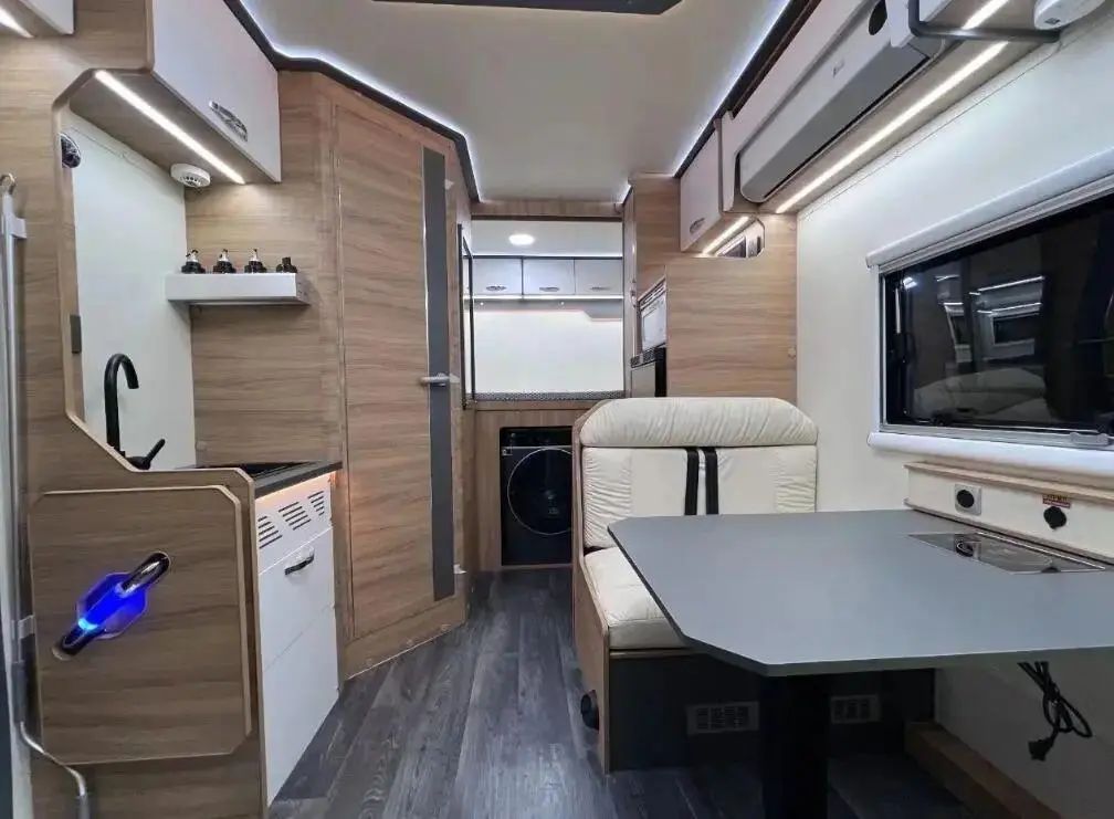 四张对排沙发设计巧妙,既可作为日常休憩的座椅,又可轻松转换为宽敞的双人大床,满足夜间休息的需求。厨房区域更是一应俱全,从洗菜池、水龙头到电磁炉、油烟机,每一个细节都透露出设计师对旅者需求的深刻理解。在这里,旅者可以亲手烹饪美食,享受家的味道,让旅途中的每一餐都充满温馨与满足。