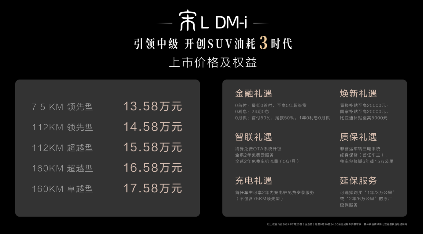 发布会上,宋L DM - i的价格也正式公布。相比同级别车型,宋L DM - i的价格具有很高的竞争力。同时,比亚迪官方还为宋L DM - i还推出了一系列的购车权益和政策,进一步提升了这款车的性价比。