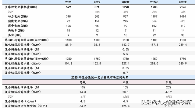 预计2025年全球复合集流体需求约21-67亿㎡,设备端复合铜箔规模超百亿元。据起点研究院数据显示,2023-2025年全球新增电池装机量将达到1298/1703/2176GWh,以新能源动力电池为主,为复合集流体市场创造了旺盛需求。假设每GWh所需铜箔和铝箔面积分别为1100万㎡,对应全球需求为7/12/19亿㎡;合计复合集流体理论市场空间为98/186/311亿元。设备环节,当前复合铜箔工艺尚不确定,假设以100%用量计算各工艺下设备空间,一步法、两步法、三步法中性假设下,分别为140/153/217亿元。