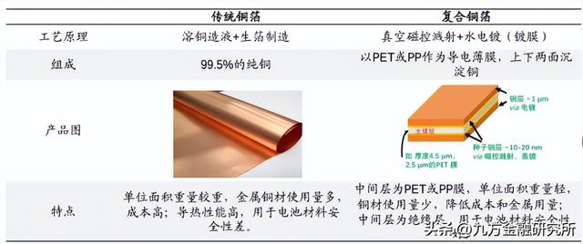 复合铜箔是一种全新工艺,以PET、PP等高分子材料为基材。复合集流体是一种采用“金属-基膜-金属”三明治结构的新型集流体材料,基膜为PET/PP/PI等高分子材料,上下两面堆积金属铝/铜,制成复合铝箔、复合铜箔后用于电池正、负极。与传统铜箔相比,复合铜箔利用了高分子基材材料PET、PP来节约金属铜,能够提升电池能量密度、增加电池安全性、降低生产成本,随着技术逐步成熟,渗透率有望逐步提升。