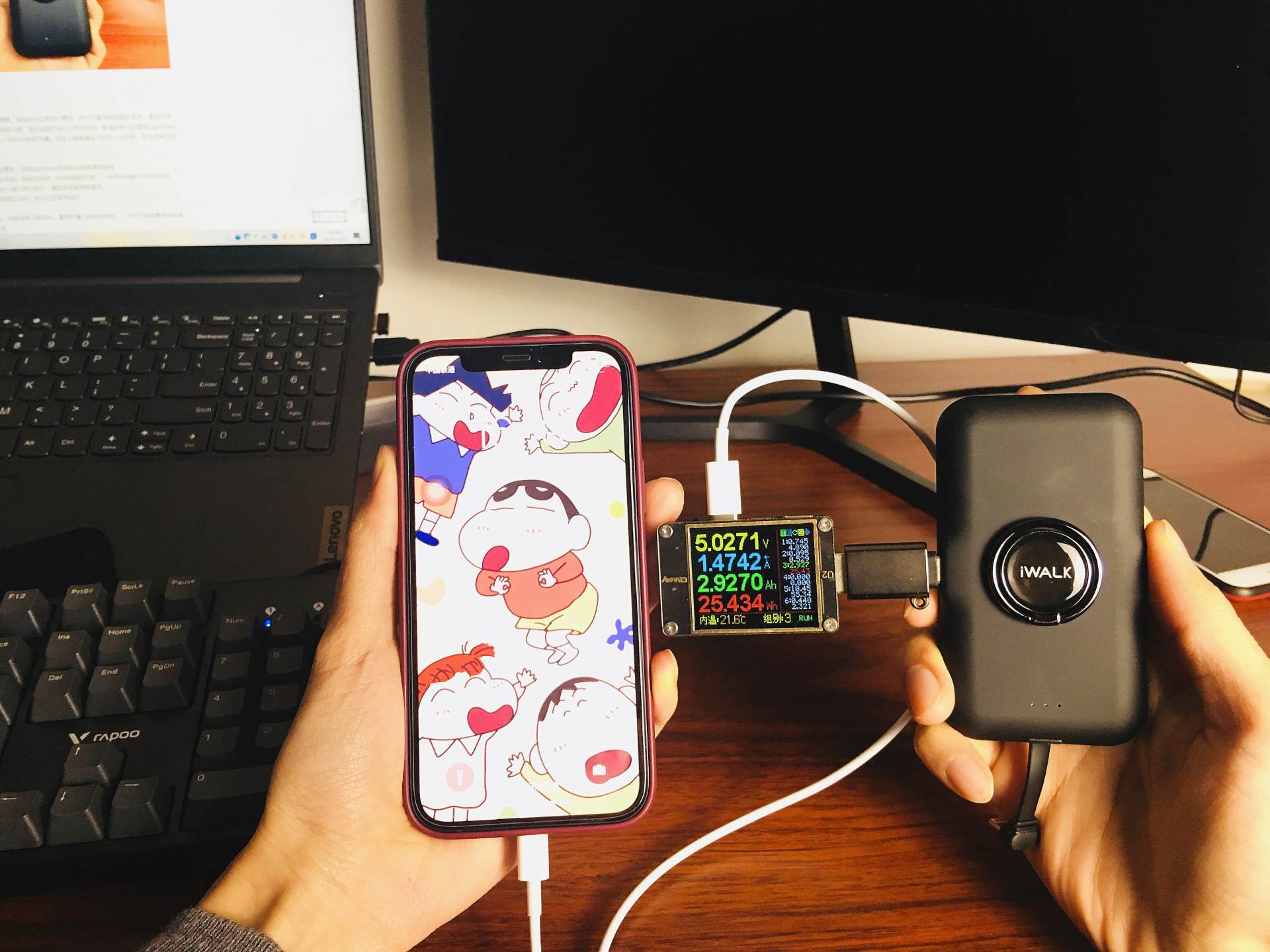▼iWALK变色龙充电宝支持双口充电,双设备充电毫无压力,实测C口输出功率7w左右,外出使用够用