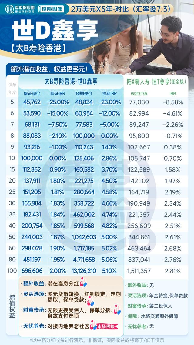 和内地的增额终身寿险相仿,太保寿险香港的「世代鑫享」规划了保底 2%复利的增额人寿保障,并且还进一步发挥出香港保单具有潜在高收益的长处,在保证收益高达 2.1%的基础上,给予长期回报达 5.1%的预期收益,现金价值通过“保证+分红”以复利的形式增长,激发出财富的无限潜力!