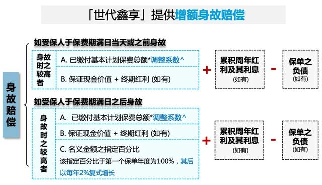 太保寿险香港的「世代鑫享」保额依照保底 2%加上分红以复利形式递增,在保费期满之后,身故保额等于以下三者之中取最大值再加上累计周年红利及利息减去负债: