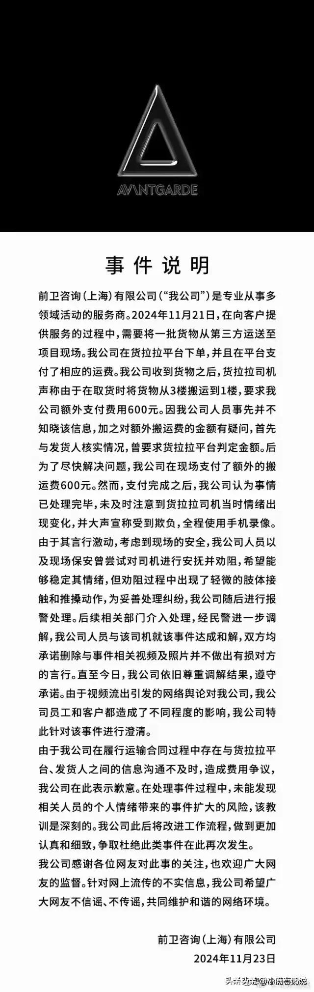 由于当时经手此事的员工并不知道事情的来龙去脉,看到货拉拉司机全程视视频录像,情绪非常激动,这也是沟通不畅的结果,目前,经过事件双方的沟通协调,600块钱搬运费已经付了!