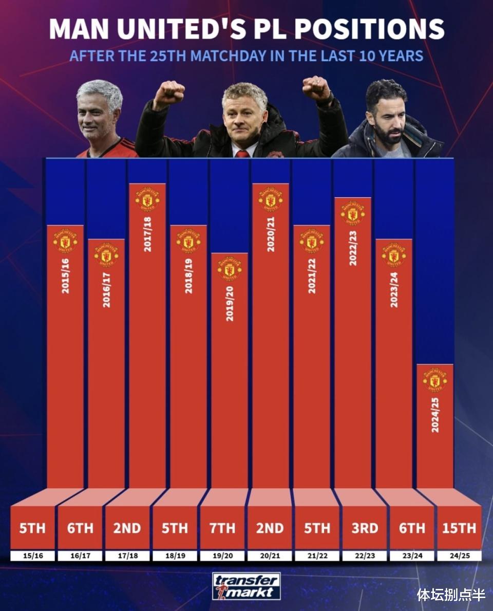 历史最差表现:2024/25赛季,曼联在第25轮后仅排名第15,这是十年来的最低排名。