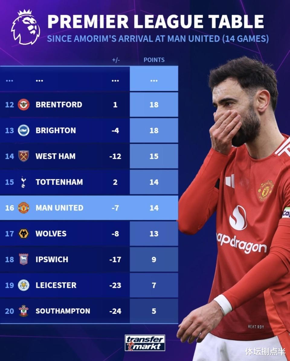 这一数据表明,曼联在阿莫林的带领下,不仅未能延续过去几个赛季的稳定表现,反而陷入了近年来的最低谷。