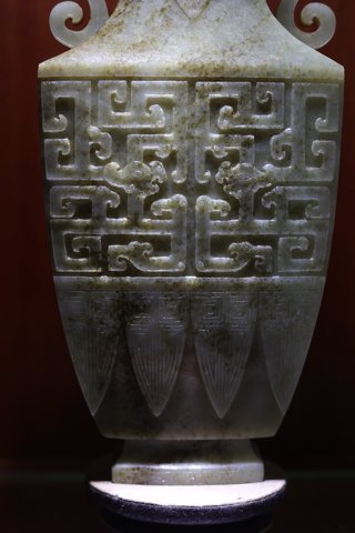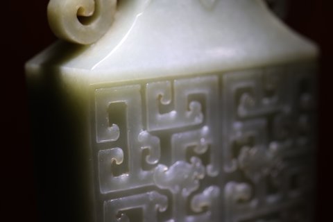 雙龍鳯耳芭蕉|玉瓶 ————————— 高25 寬4.2 長10公分 重966克 .玉料細密柔和、瓶呈扁平形,蓋與瓶身,子母口、扣合嚴密。瓶口位置雕刻:回字紋、頸兩側雕雙鳳耳,向下延伸淺浮雕:芭蕉紋、腹部雕刻雙龍紋飾,采用多層技法、層次分明、造型規整、大氣不失細節,掏膛均勻,打磨、勾勒皆精細縝密,雅意別具,堪稱古代玉雕佳作。