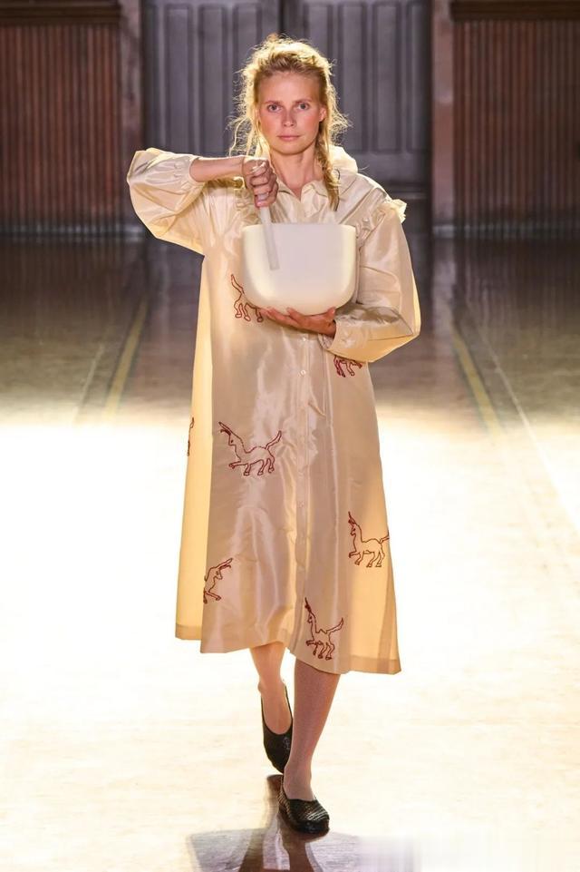 ▲ 颠覆传统,探索新境_在这一季的作品中,Tolegen大胆地颠覆了品牌以往轻盈、飘逸的形象,加入了更多木质与暗系的元素,体现出她对自然与人性深刻的思考。开场时,一位模特手持白色音钵,身着奶油色的缎面长裙,裙面上点缀着红色珠绣的神话生物图案,瞬间打破了秀场的宁静,带来一种强烈的视觉冲击。这一幕不仅展现了设计师对传统美学的再创造,也传达出一种深邃、神秘的情感。