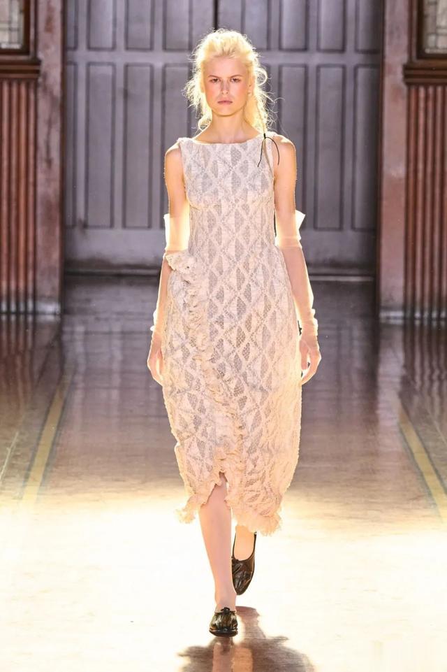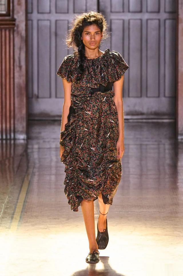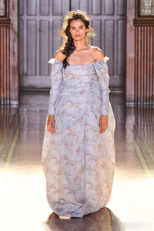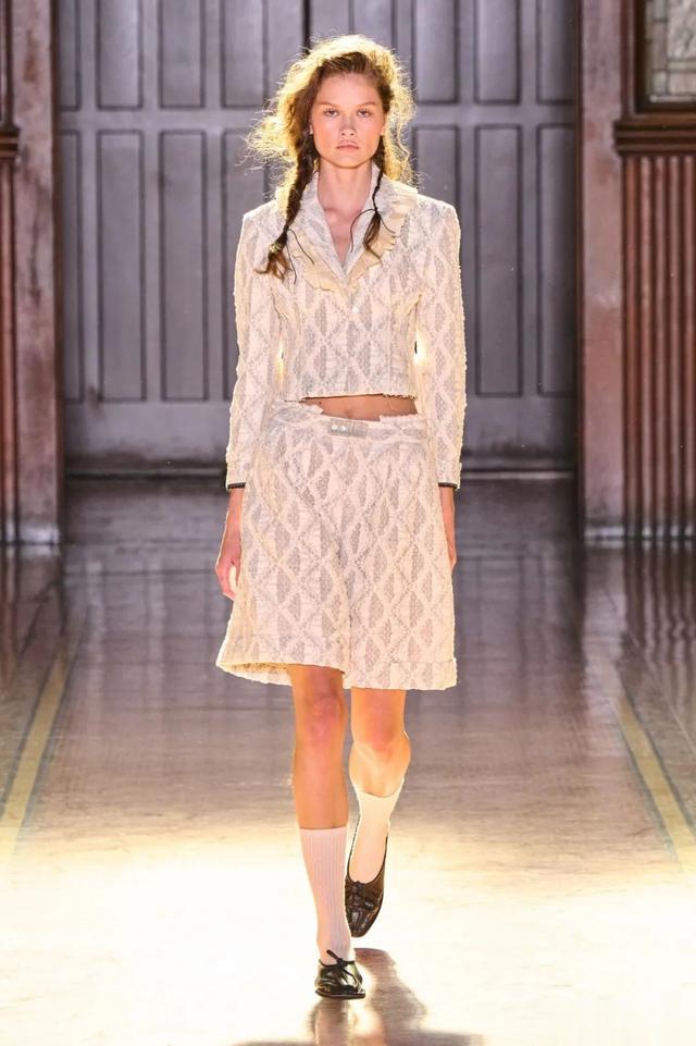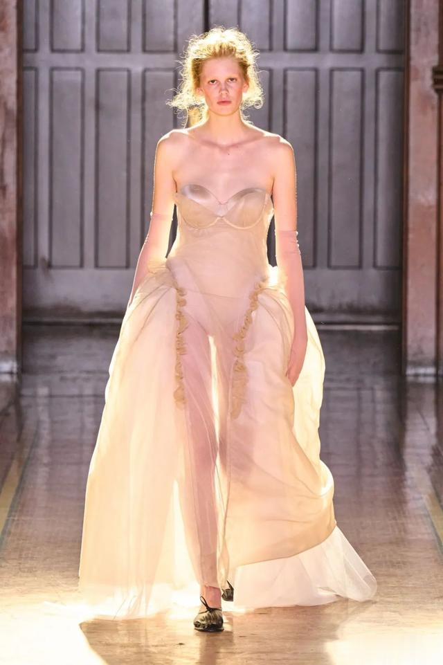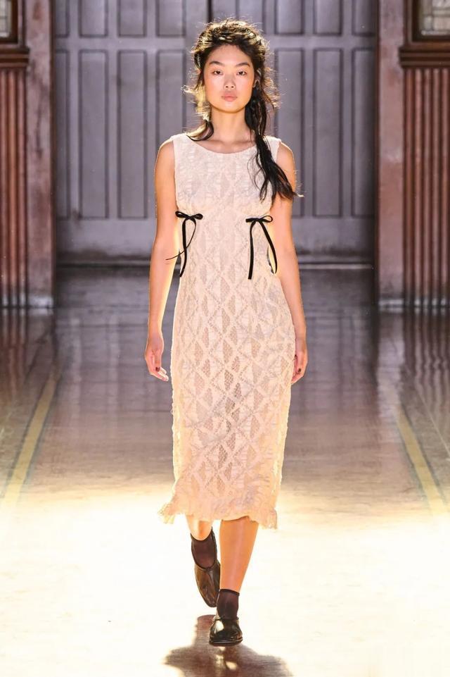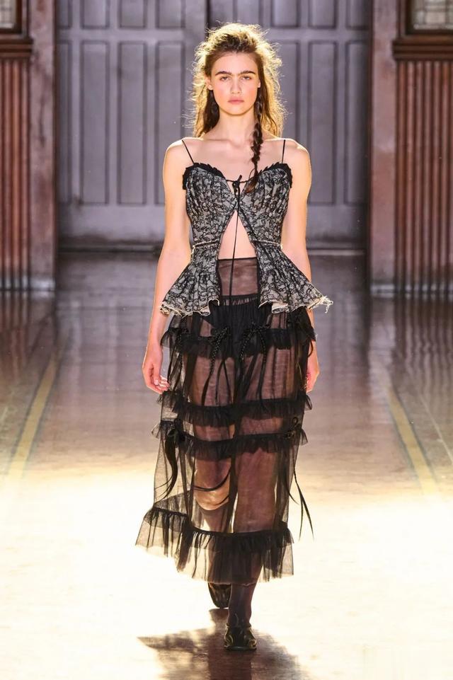 ▲ 色彩与材质的交融_在整个秀场中,黑色与奶油色的交错,形成了一种独特的视觉对比。绳索蕾丝、荷叶边以及爱德华时期的花卉印花,各种元素的巧妙结合,展现了设计师对细节的极致追求与对历史深刻理解。Tolegen还别出心裁地采用了真人头发制成的蝴蝶结和马鬃毛织物,这种创新的材料选择为服装带来了独特的触感和视觉效果,让人不禁想要靠近,感受那份真实与非凡。