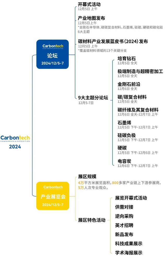 第八届国际碳材料大会暨产业展览会(Carbontech 2024)将于12月5-7日在上海新国际博览中心W1、W2、W3馆盛大举行,本届展会预计展出面积40,000m2,汇集超800家全球碳材料产业链上下游厂家。同期举办主题论坛9场,闭门研讨会1场,吸引来自金刚石、超精密加工、石墨烯、碳纳米材料、碳纤维及其复合材料、碳碳复合材料、新能源碳材料等领域超50,000国内外采购商莅临现场,为全球买家打造一个专业、创新、交流的全产业链合作盛宴。