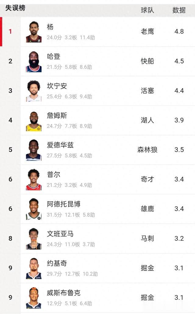 本季NBA场均失误榜单上,哈登与詹姆斯这两位超级巨星赫然在列,令人不禁感叹:即便是明星球员,也难以逃脱失误的困扰。