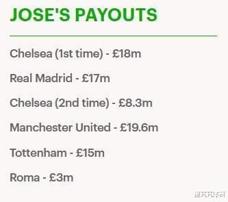 就此,就产生了文章谈到的“解雇”问题。计算综合盘点,穆帅整个生涯违约价格相加居然有1.1亿英镑,这的确是人类足坛几乎难再遇见的“奇迹了”。其中,切尔西贡献了2630万英镑(包括2007年第一次解雇的1800万,及2015年的830万英镑)。皇马时,他的违约价是1700万英镑则也被激活了,再往后的曼联约给到了1960万英镑、热刺1500万、罗马300万,这的确是太多了的。
