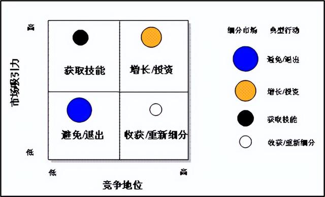看客户的目标是找寻战略业务机会点。从目标客户群的需求出发,对市场进行细分,然后对细分市场进行评估,最终确定战略性业务机会。通常采取SPAN矩阵对细分市场进行评估,然后采取针对性的行动策略。如下图所示。