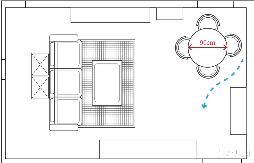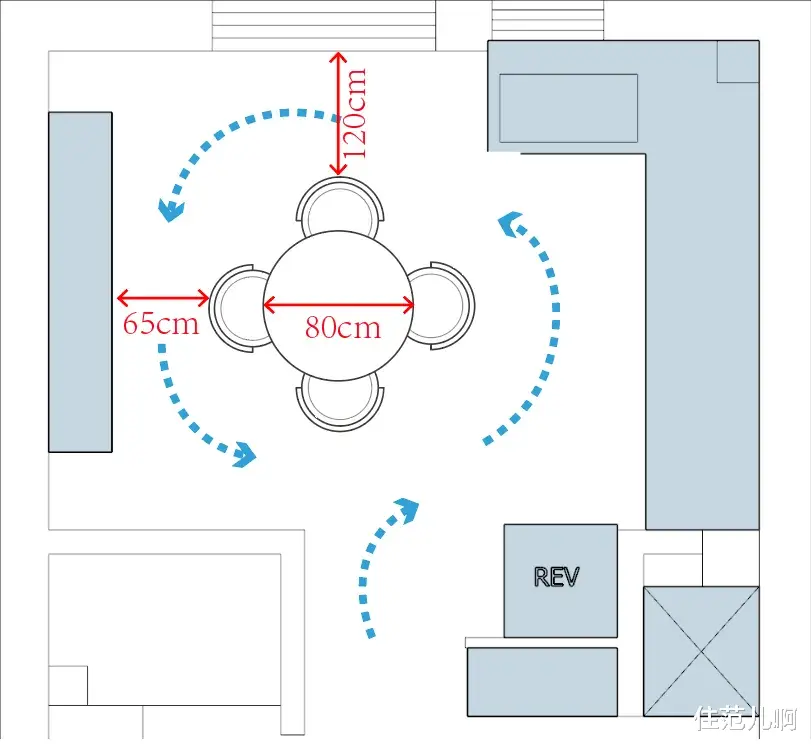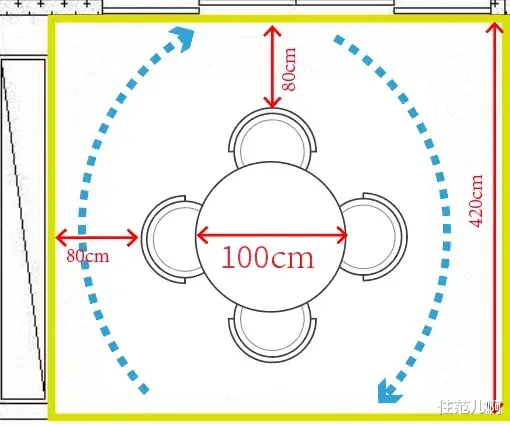 在下图这个边长约 420cm 的餐区,这张直径 100cm 的圆桌和四周之间都有至少 80cm 的通道。