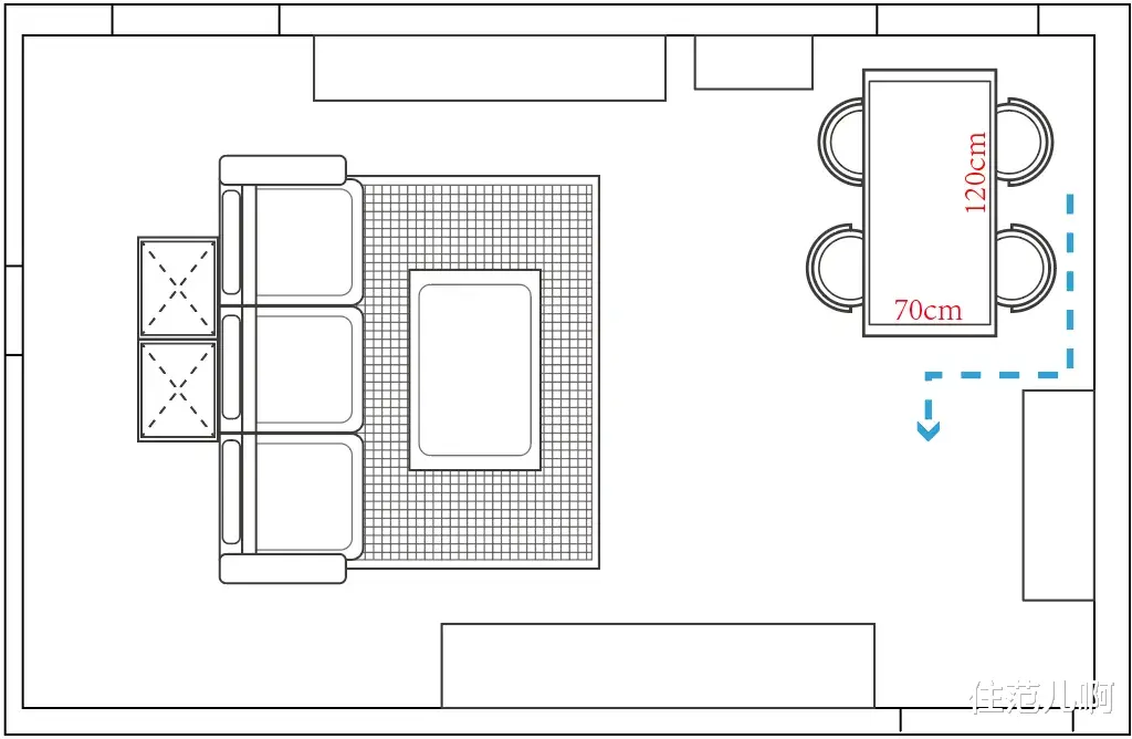 以 4 人用餐为例,一张 70×120cm 的长桌,占地 0.8㎡,把小夹角填得满满当当。